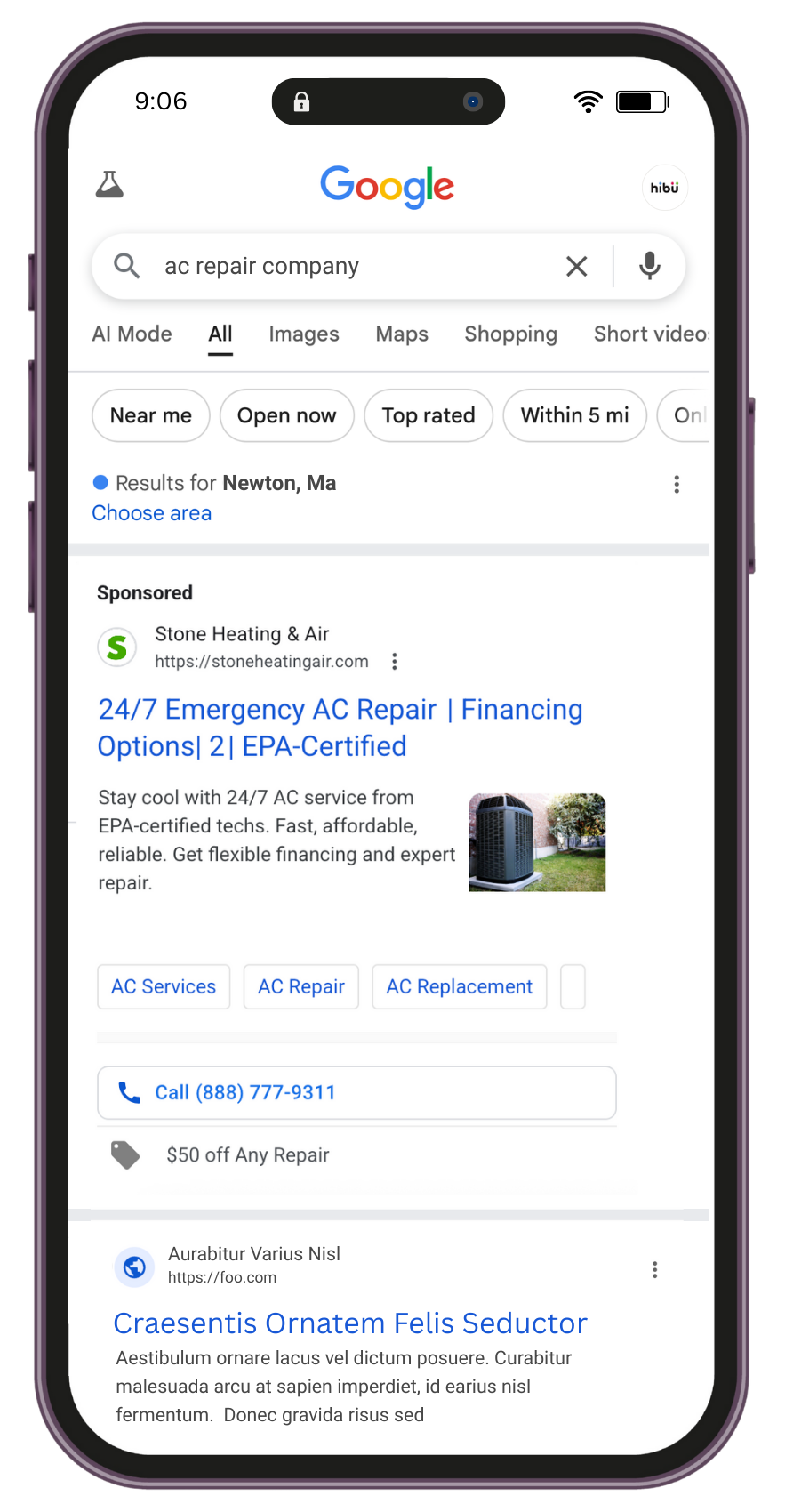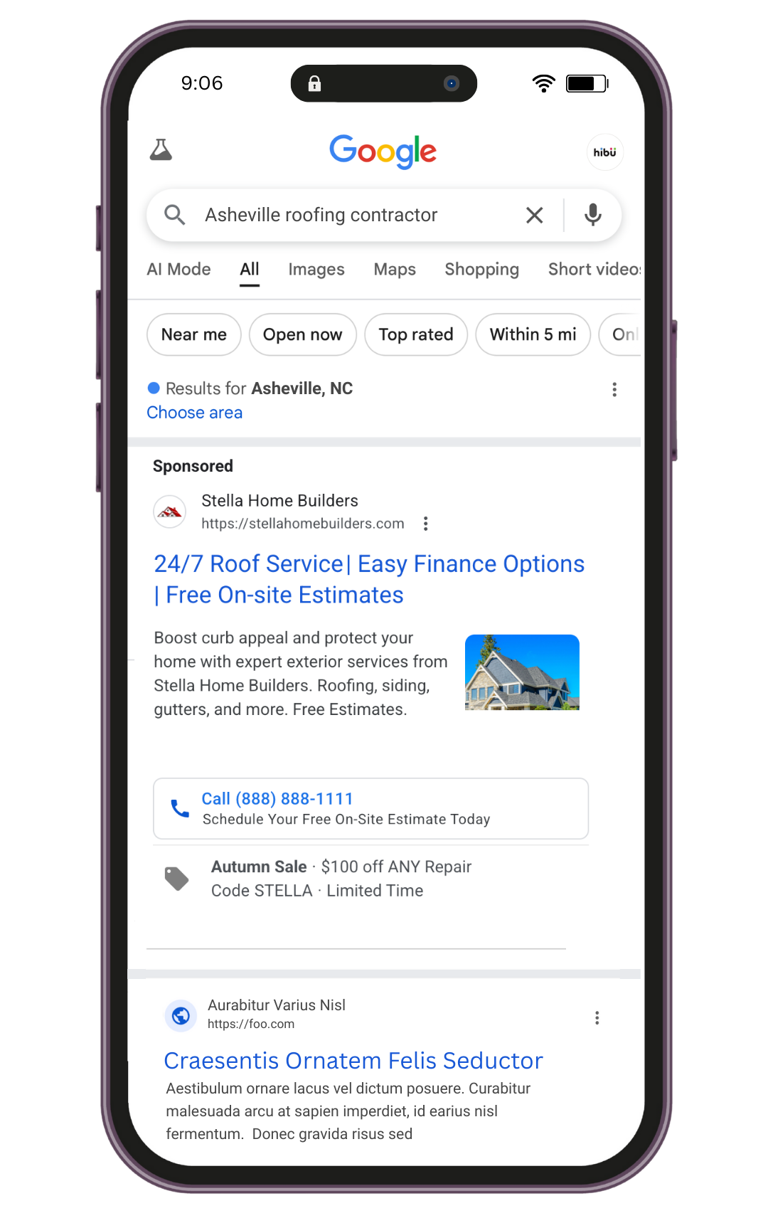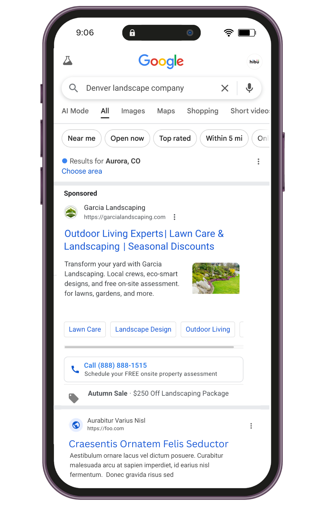 The examples below are each representative of a complete Hibu One solution. The actual services in your marketing solution will depend on budget and goals. All marketing results shown below are illustrative only – actual results will vary.